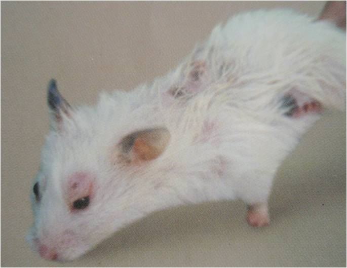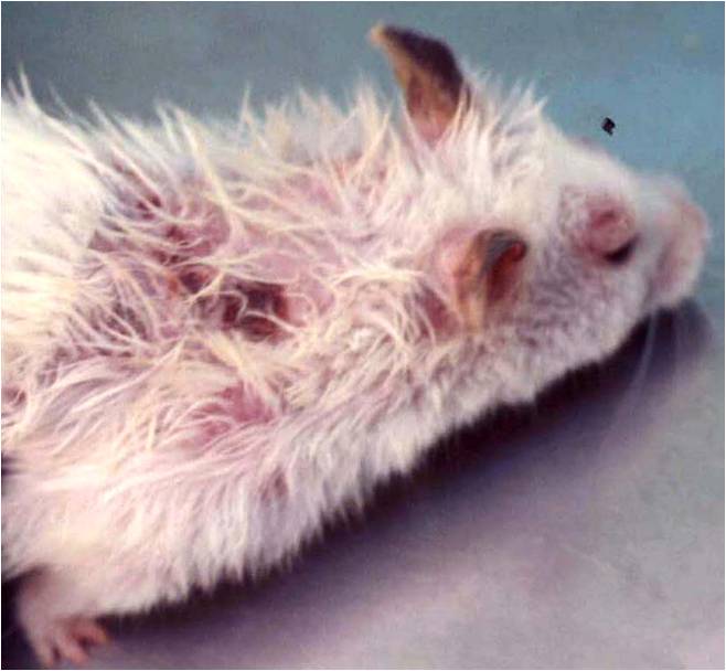 Se presenta en la consulta de dermatología un hámster chino, macho, de cuatro años. Los propietarios comentan que hace dos semanas que ha perdido el apetito, está apático y apenas se mueve. También notan que está perdiendo el pelo. Desde que lo compraron, nunca ha salido de casa. No convive con otros animales.