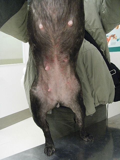 Durante el periodo comprendido entre la aparición de los signos clínicos y nuestra consulta fue tratada con antibióticos, corticosteroides y champús para seborrea oleosa. Se había cambiado varias veces de marca de pienso, pero solo se habían conseguido leves mejorías.