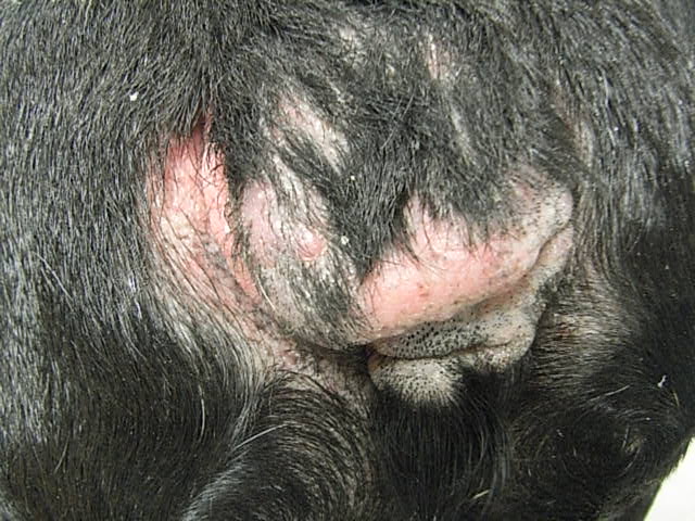 Figura 6. Lesiones eritematosas y escamosas en la zona craneal de extremidades anteriores.