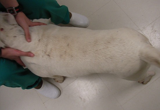 En la piel se aprecia una alopecia multifocal en la zona dorsal del tronco (fig.1), áreas ventral (fig. 2) y lateral del cuello (fig. 3), y en las patas.