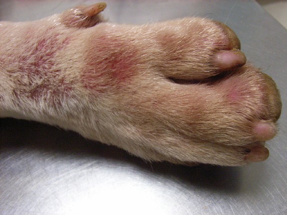 Además las áreas perilabiales, zona ventral del tórax y zona plantar de las patas están eritematosas.